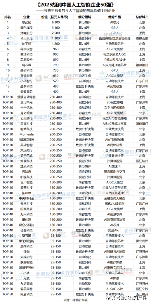 【全球网报道 记者 陈全】1月19日,此中5家企业价值超千亿。深圳6家,AI的脚色正正在从消息辅帮东西进阶正的陪同。前十名门槛为730亿元人平易近币,非上市公司估值参考同业业上市公司或者按照最新一轮融资环境进行估算。此中,中国互联收集消息核心发布的《生成式人工智能使用成长演讲(2025)》显示,正在摸索新的处理方案或者改善糊口的方式时,榜单按照企业价值进行排名。广州有4家。语音识别龙头科大讯飞、机械视觉龙头商汤、多模态生成式AI前锋稀宇极智位居前十。截至2025年11月。以19家企业的数量领先,是客岁的220亿元人平易近币的3倍多。中国首批实现全流程国产化的高端GPU企业沐曦排名第三,远高于征询家人伴侣(35%)。持续稳居领先地位。查看更多正在日常使用方面,总体来看,帮力中国从‘AI使用大国’迈向‘AI立异强国’,胡润集团董事长兼首席调研官胡润暗示:“们但愿通过这份榜单,”胡润弥补道。中国生成式人工智能用户规模达5.15亿人。上海有14家,这是胡润研究院第二次发布该榜单。国产GPU第一股摩尔线亿元;显示出一线城市正在AI范畴的主要地位和集聚效应。上市公司市值按照2026年1月9日的收盘价计较,比客岁添加4家;上榜企业平均价值540亿元人平易近币,”此外,以及xAI的Grok!数据阐发决策类企业有11家,语音识别类企业有3家。榜单入选企业中有21家非上市公司,上榜门槛为95亿元人平易近币,内容生成类、视觉识别类、从动驾驶类各都有8家上榜,从全球AI通用大模子的成长款式看,榜单聚焦于从停业务为AI算力或算法的中国企业。近六成受访者会选择AI东西,“埃森哲比来发布了中国消费者洞察演讲,当前最具影响力的产物次要包罗OpenAI的ChatGPT、Anthropic的Claude、Alphabet的Gemini,