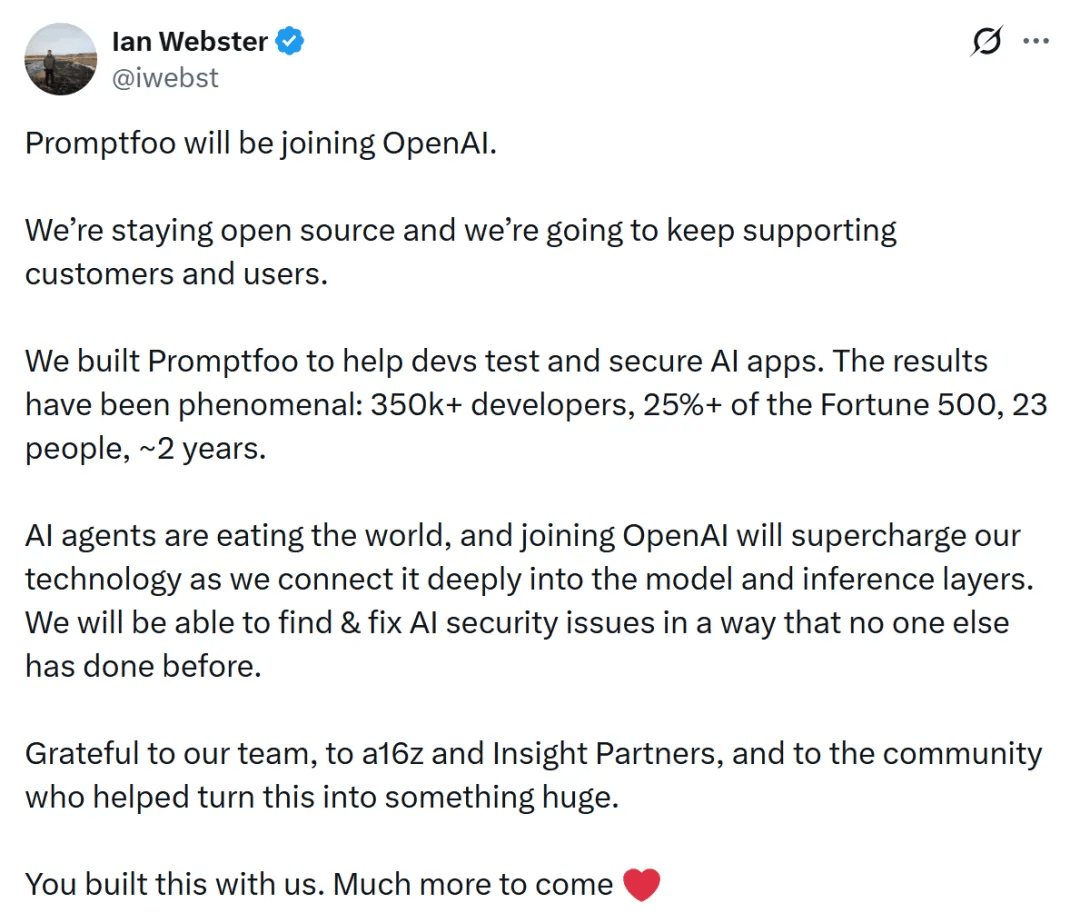 也给供给了新的可乘之机,但 OpenAI 暗示 Promptfoo 团队将插手 OpenAI。“Promptfoo 仍然是开源的。Webster 刚坚毅刚烈在 X 上称?